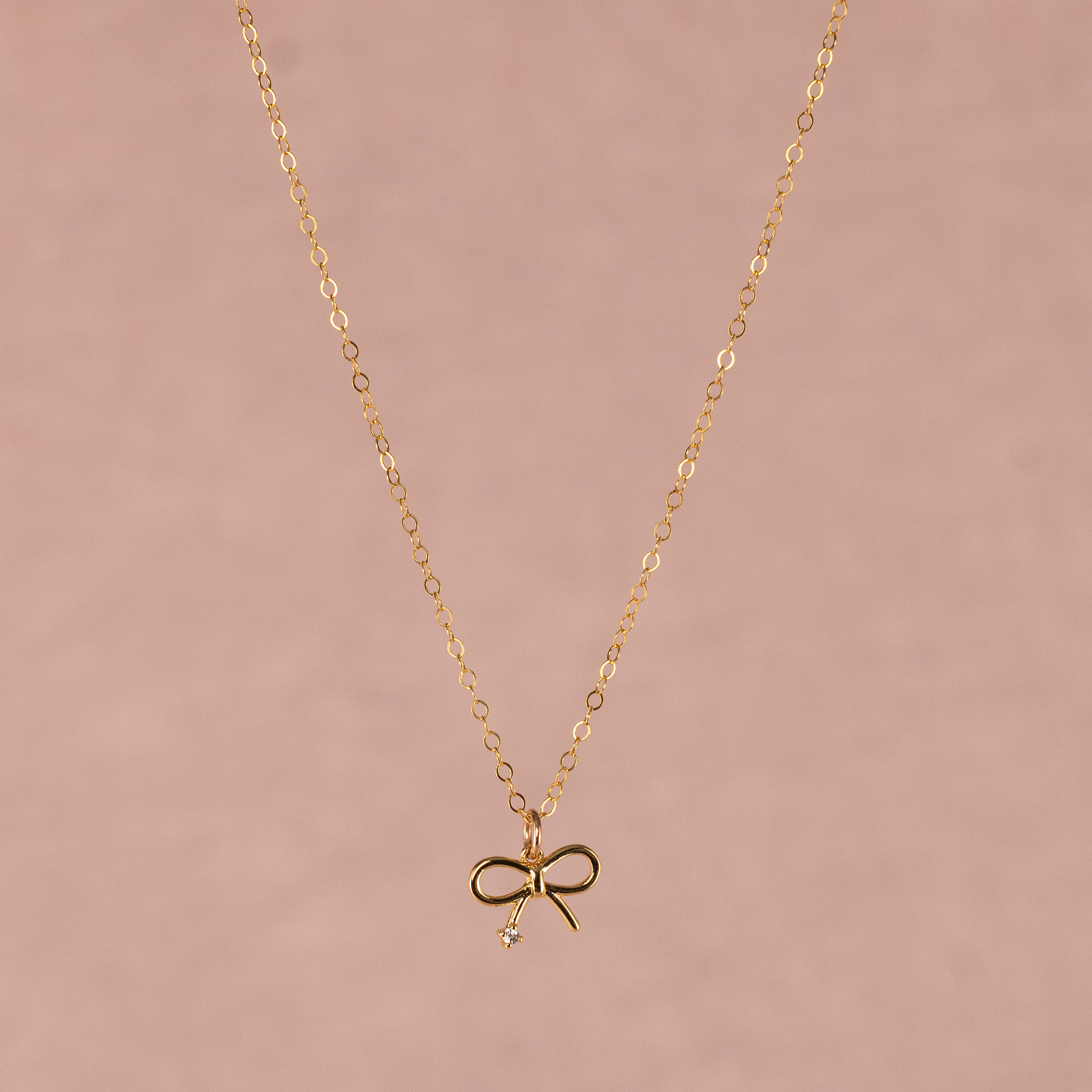 Add a touch of charm with this 14k gold filled dainty bow pendant. Its delicate design brings playful elegance to any outfit, perfect for layering or wearing solo to brighten your day. Lightweight and luminous, it’s a sweet little accessory that effortlessly adds sparkle and smiles.