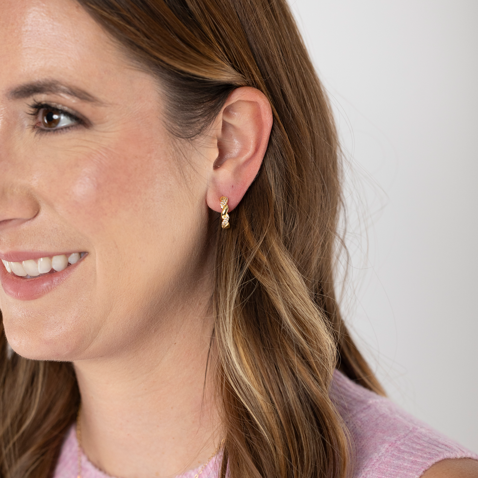 Elevate your style with the playful charm of CZ Twist Huggies. Their unique twist design is sparkling with cubic zirconia, adding a lively touch to any look. Perfect for mixing, matching, or wearing solo, these huggies bring fun and flair wherever you go.