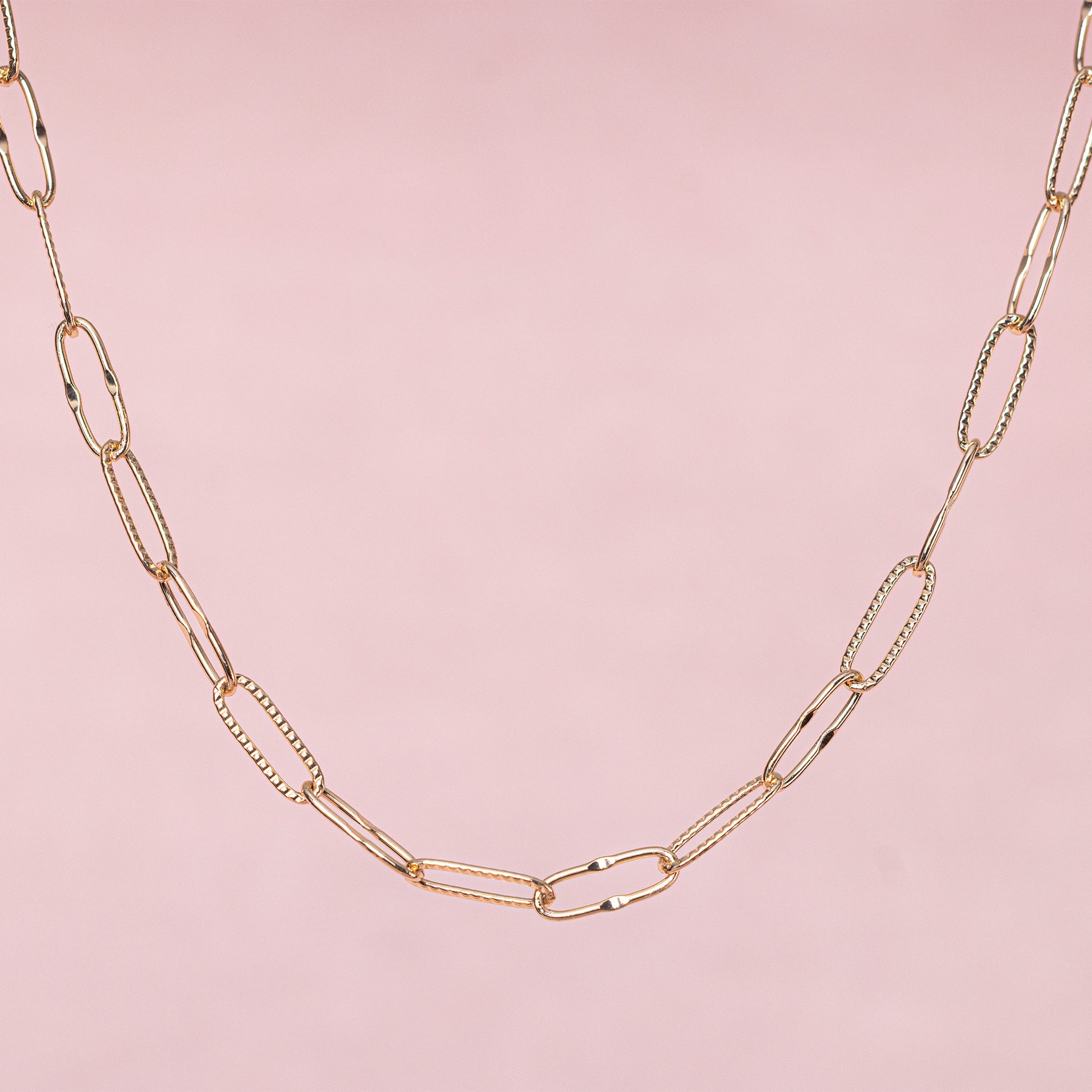 Add a pop of personality with the Emery Chain—a gold-filled bold beauty featuring larger textured links. Perfect to layer up or wear solo as a standout statement piece, it brings effortless edge and shine to any outfit. Let your style shine bright and bold!