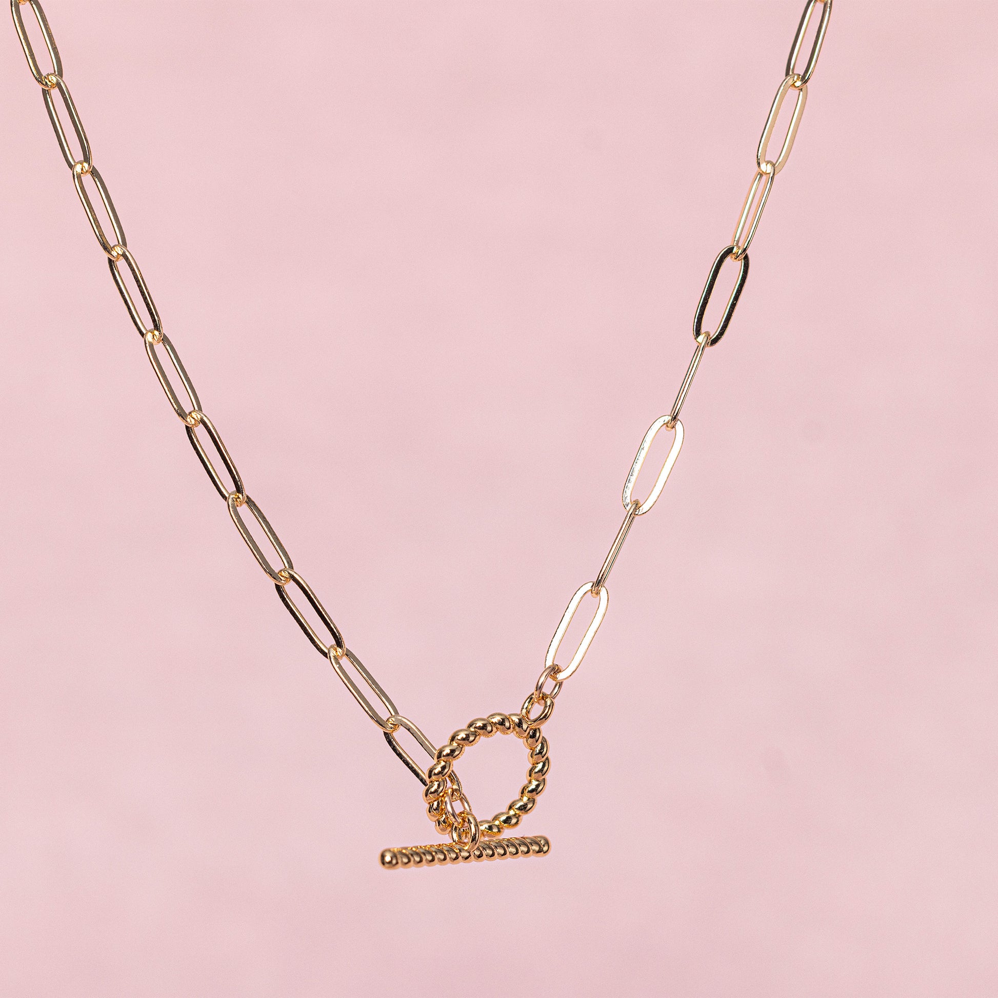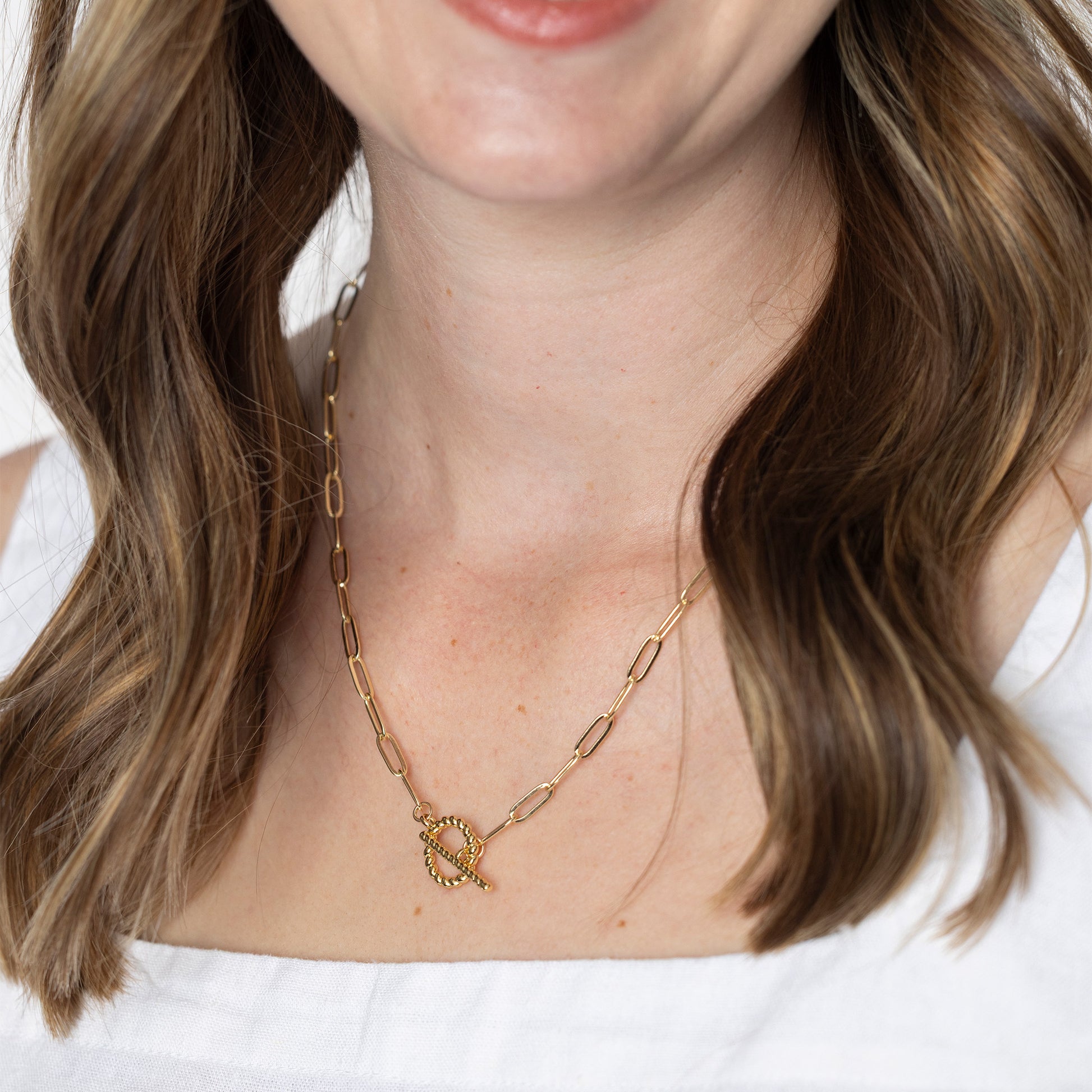 Add a playful touch to your look with the Emmie Toggle necklace. Featuring bold, standout links and a unique braided front toggle clasp, this chain combines edgy style with unexpected charm. It's the perfect piece to brighten your outfit and keep your accessories fun and fresh.